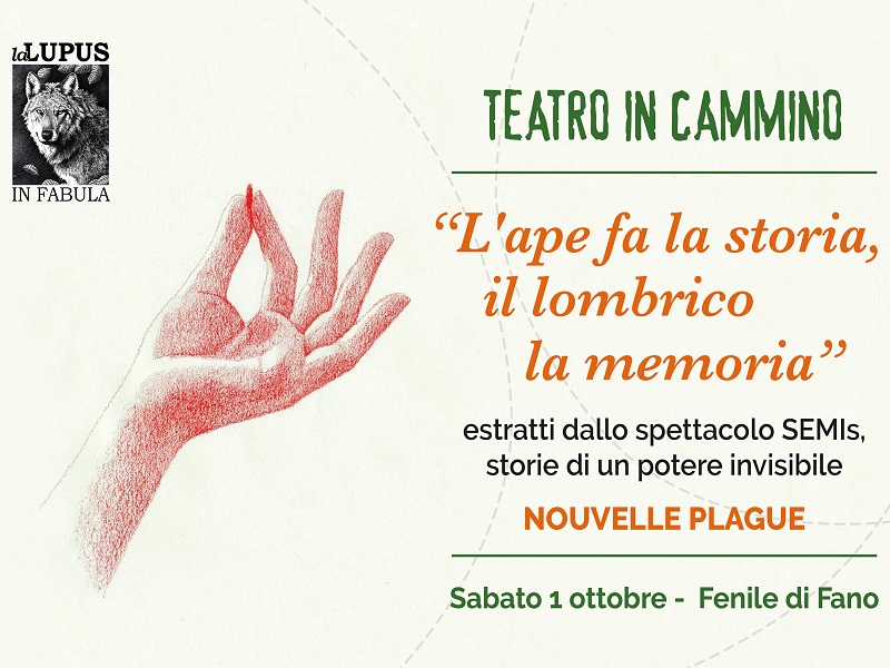 La Lupus in Fabula propone una formula originale il semplice gesto del camminare si incontra con la bellezza della natura e le suggestione del teatro. Cammineremo con gli attori della compagnia La Nouvelle Plague tra i prati, i campi e il bosco, sulle colline tra Centinarola e il Prelato, con vasti scorci panoramici che spaziano dal mare all’Appennino, Durante alcune soste verranno proposte alcune riflessioni in chiave teatrale che ruotano sul legame con la Terra e sul cibo che ci nutre. Un anziano signore e una figura femminile misteriosa condurranno il pubblico attraverso storie di vita e di agricoltura, raccontando una battaglia silenziosa, quella sui semi, che riguarda il futuro di tutti.